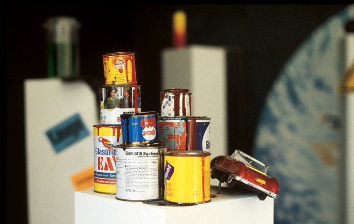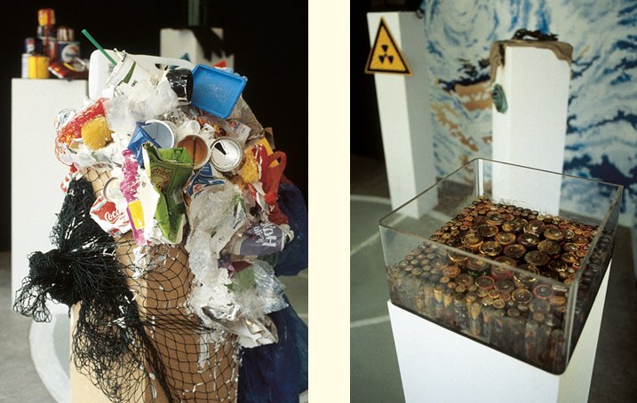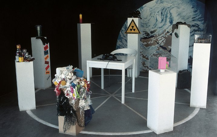 „Wie lange noch blauer Planet?" heißt die Installation im Niedrigenergiehaus des Landkreises bei der wie in einem modernistischen Stonehenge acht Säulen mit verschiedenen Müllarten, in einem Kreis angeordnet sind. Dahinter schwebt, mit Acrylfarben auf eine Holzwand aufgemalt, der verletzliche, wertvolle blaue Planet durch das schwarze Weltall. In der Mitte steht ein weißer Holztisch mit dem (realen) Umwelttelefon des Landratsamtes. Der Teufelskreis der Umweltverschmutzung hat unterschiedliche Schattierungen, die Säulen sind daher auch unterschiedlich hoch. Das neue Stonehenge ist 1990 ein Signal, das nachhaltig eine Wirkung entfaltet hat.