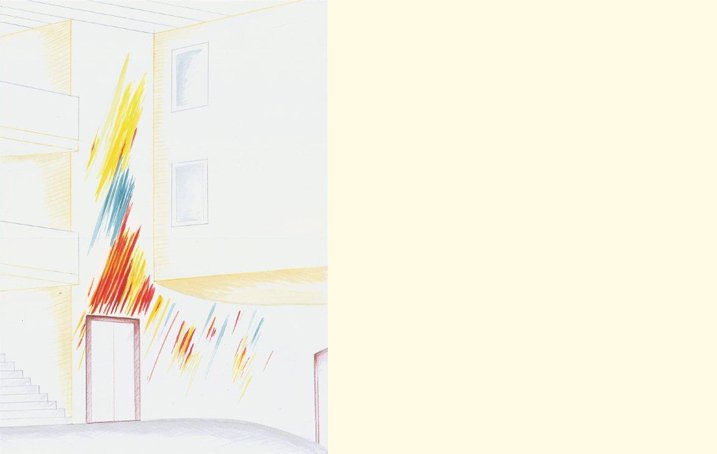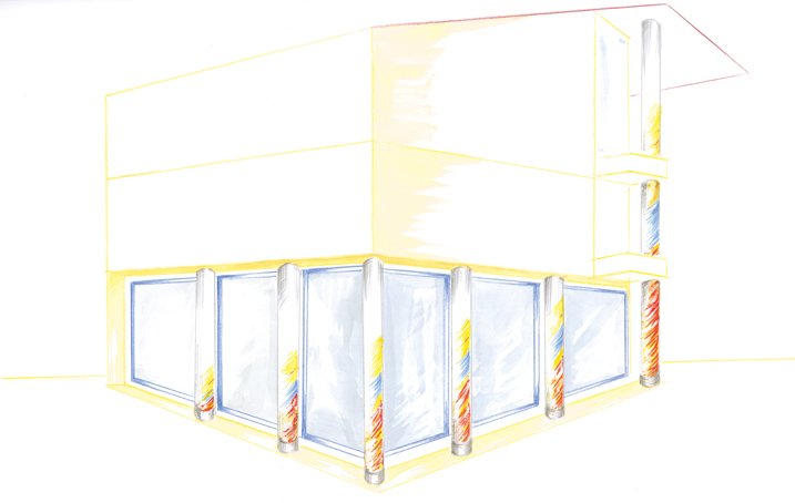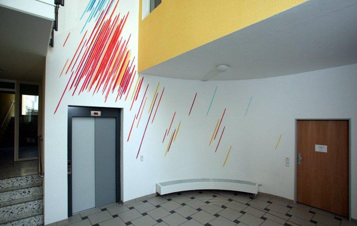 Dieses Kunst am Bau Projekt besteht aus zwei Teilen. Im Außenbereich werden die Säulen rund um das Gebäude gestaltet, im Innenbereich das Foyer mit der Aufzugswand bis zum lichten Glasdach. Die Idee ist eine sich aufbauende Lichttreppe in den Spektralfarben. Beginnend mit den dunklen, erdigen Farbtönen am Boden wie Rot und Orange, verdichten sich die im 25-Grad-Winkel mit Dispersion und Acryl angebrachten Farbstriche zu blauen und, je weiter es nach oben geht, hellen und gelbweißen Schattierungen. Durch die streng durchgehaltene Neigung der Farbstriche entsteht Dynamik, ein Linientanz um die Säulen bis in zehn Meter Höhe.